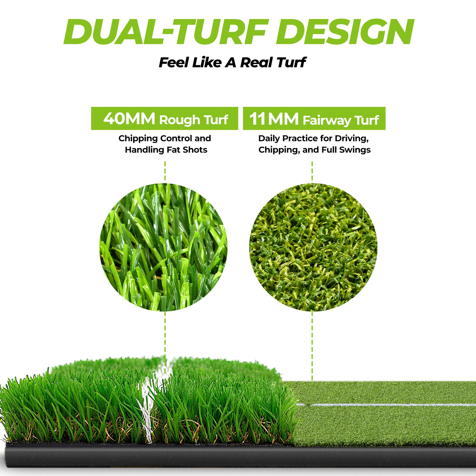 - 5x4ft Commercial-Grade Dual-Turf Design: Train without limits on the extra-large 5x4ft golf matt, designed to give golfers ample space for every swing. It combines 11mm fairway turf for driving, chipping, and full swings with 40mm rough turf for better chipping control and handling fat shots. Experience the real course feel at home with this golf swing mat